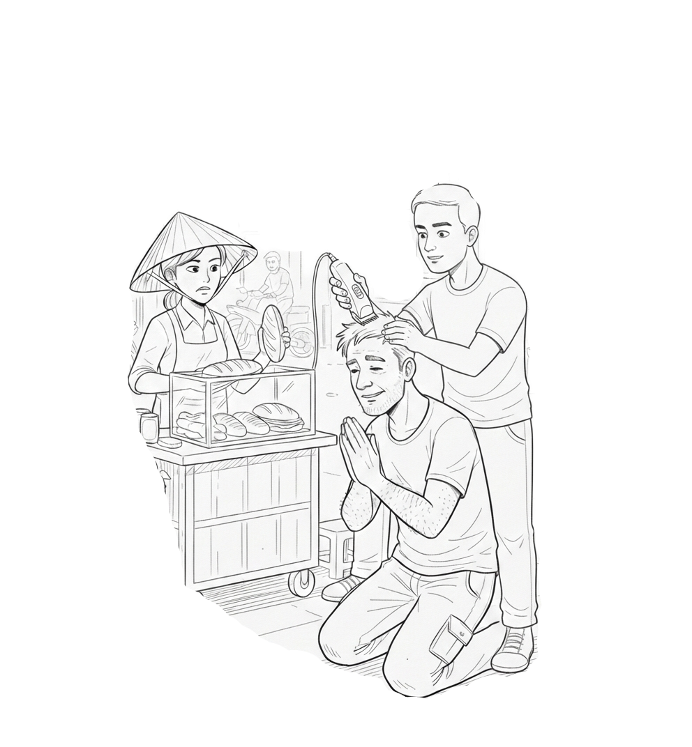 Vo Vietname často stretnete mužov, ktorí v krabici zavesenej okolo pliec nosia najrôznejšie prostriedky na opravu topánok. Jeden okolo nás prešiel a začal mi rukami nohami vysvetľovať, že takto nemôžem chodiť. Najviac ho vydesilo, keď si všimol, že sa mi guma na boku topánky už trochu odliepa. Keď som mu slušne naznačil, že o opravu nemám záujem vydal zo seba iba zvuk taký znechutený, že nás to s Duškou extrémne pobavilo. Znel, akoby ho nadrapilo.
